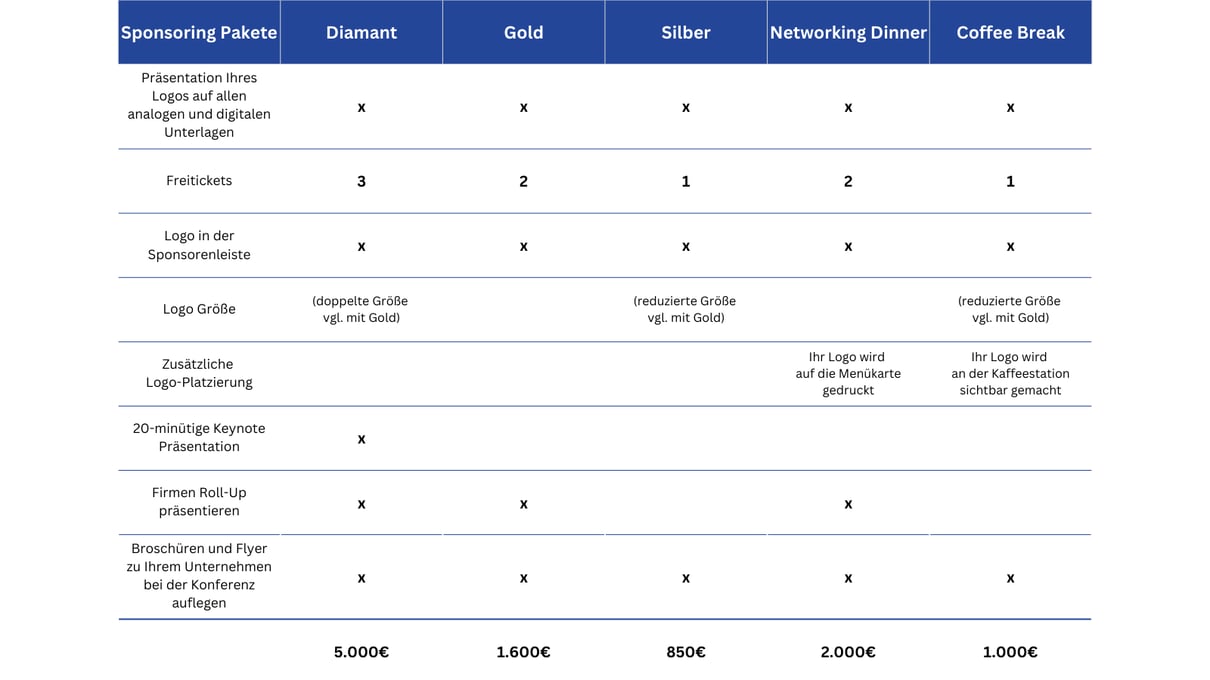 Die angeführten Modelle (Diamant, Gold und Silber) beinhalten die Präsentation Ihres Firmenlogos auf allen offiziellen analogen und digitalen Unterlagen und Materialien zur Veranstaltung, sowie ein Loop der Firmenlogos im Foyer der Veranstaltung!